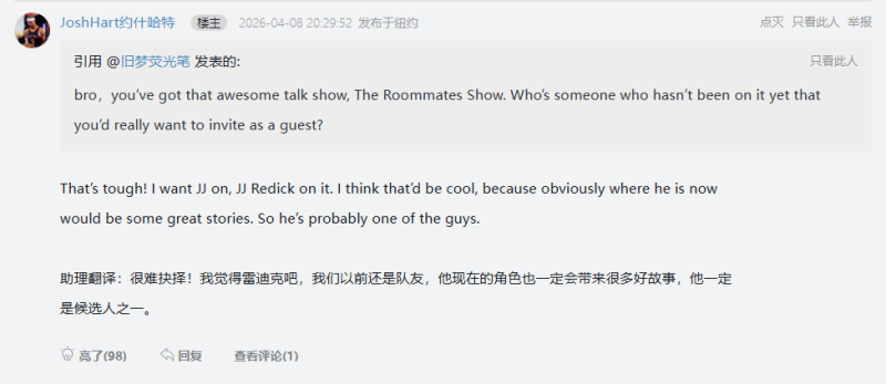 虎扑04月09日讯 昨日,尼克斯球员约什-哈特正式入驻虎扑,并在AMA环节与虎扑JRs进行互动。